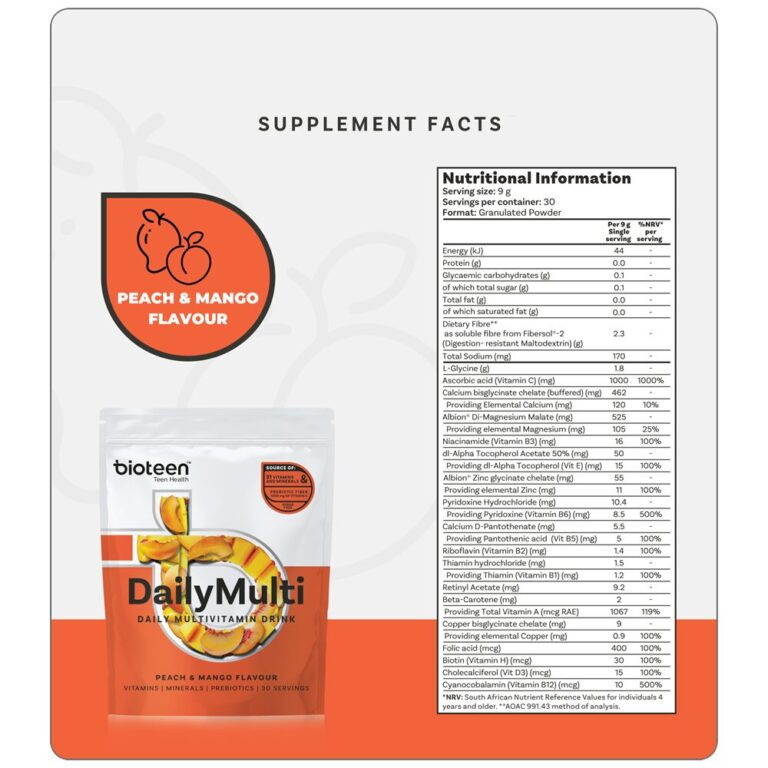 The Bioteen DailyMulti is an exceptional choice for individuals seeking a high-quality multivitamin powder that supports teen nutrition, immune health, energy levels, and overall well-being. With its comprehensive blend of essential vitamins, minerals, and additional nutrients, this dietary supplement is ideal for promoting a healthy, active lifestyle. Whether you’re boosting immunity, enhancing energy, or improving bone health and cognitive function, the Bioteen DailyMulti is your trusted partner in maintaining optimal nutrition