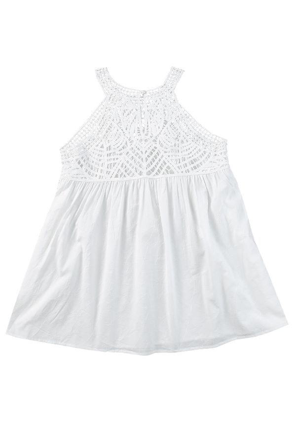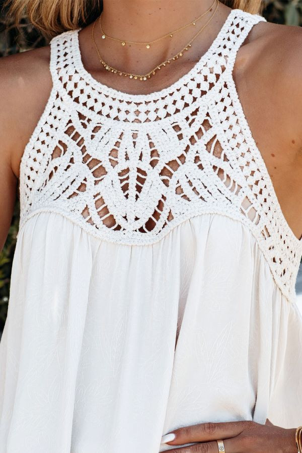White sleeveless babydoll top with lace crochet detail and loose fit hemline