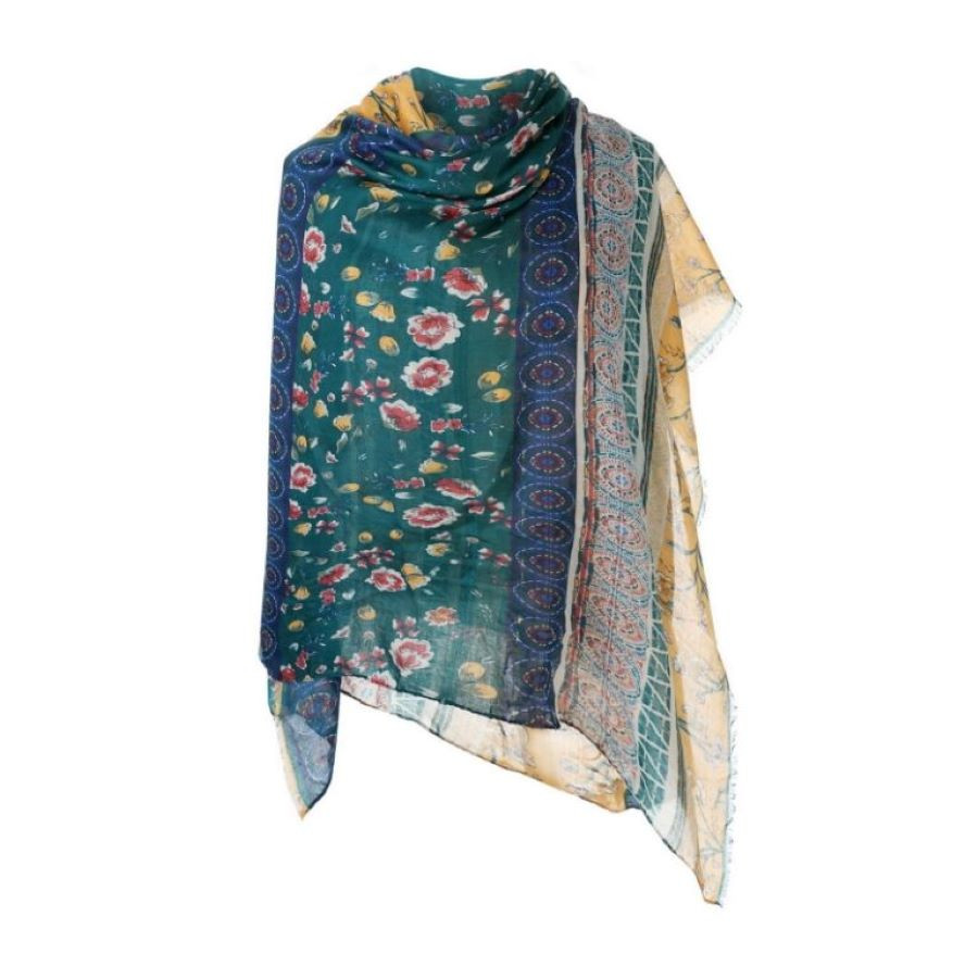 Soft lightweight SoGood-Candy scarf featuring a floral panel print in blue, green and yellow tones